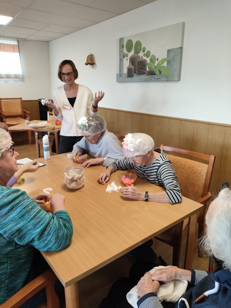 Nach der Rückkehr zum Seniorenzentrum warteten weitere unterhaltsame Stationen auf die Teilnehmenden. Beim Dosenwerfen und beim Wäscheaufhängen waren Geschicklichkeit, Koordination und Teamgeist gefragt – und der Spaß kam dabei natürlich nicht zu kurz.